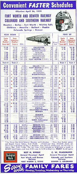 The new Twin Star Rocket operated the Minneapolis–Kansas City segment of the trip in daylight hours in both directions, so no sleeping cars were initially carried between those cities. At Kansas City the southbound Twin Star Rocket added a lightweight 8-section, 5-double bedroom sleeping car for the overnight run to Houston. The northbound train carried another 8-section, 5-double bedroom sleeping car between Houston and Kansas City. The two lightweight streamlined sleeping cars originally assigned to the Twin Star Rocket were Forest Canyon and Thompson Canyon, two cars originally assigned to the Rocky Mountain Rocket as Kansas City–Denver cars. The Twin Star Rocket served Saint Paul Union Depot, Albert Lea, Des Moines, Kansas City, Topeka, Wichita, El Reno, Fort Worth and Dallas en route to Houston from Minneapolis. By 1957 the sections were replaced by modern roomettes.[2]