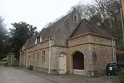 The front (facing east over the gardens towards Backwell Hill) and north (entrance courtyard) are faced in one shade of ochreous Bath Stone,[24] while the south (rear), which is mainly allocated to the service area and servants quarters, is faced in cheaper red-tinged Draycott marble rubble,[24] and has some plastered finishes. All façades have many Gothic main windows, Tudor oriel windows, chimneys and attic dormers.[25] Norton topped the design with an irregular roof, its various pitches and gables emphasising the building's asymmetrical architecture.[24] The final external addition was a huge ironwork conservatory by Hart, Son, Peard and Co. to the rear.[28] The result was described by novelist Charlotte Mary Yonge, a cousin of Blanche Gibbs, as "like a church in spirit".[17]