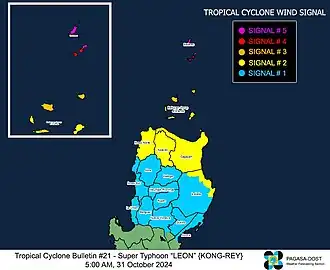 - ^ "Severe Weather Bulletin #22 for Super Typhoon 'Leon' (Kong-rey)" (PDF). PAGASA. 31 October 2024. Retrieved 31 October 2024.