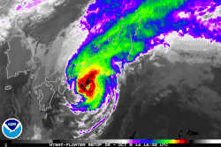 Typhoon Phanfone passed near the southern coast of Kii Peninsula around 03:00 JST on October 6 (18:00 UTC on October 5).[18] The eye immediately dissipated, as well as the system started to undergo extratropical transition right before making landfall near Hamamatsu of the Shizuoka Prefecture in Japan after 08:00 JST (23:00 UTC on October 5).[19] The JTWC issued the final warning to Phanfone early on October 6, and the system completely became extratropical at noon.[20][21] The storm stopped weakening and began to deepen again early on October 7, and it crossed the International Date Line as a powerful extratropical cyclone early the next day.[22] Post-Tropical Cyclone Phanfone, which was located about 890 km (555 mi) southwest of Unalaska, Alaska, reached peak intensity of its extratropical period at noon on October 8, with a barometric pressure of 948 hPa (27.99 inHg) and hurricane-force winds.[23] The system started to weaken again early on October 9, and it turned northward early on October 11.[24][25] The system eventually moved inland over Southcentral Alaska early on October 12 and dissipated later that day.[26][27]