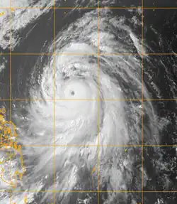 Rammasun continued to intensify and was designated as a severe tropical storm late on May 8.[10] The next day both the JMA and the JTWC reported that Rammasun had intensified into a typhoon.[11][12] Later that day the JTWC reported that the typhoon had rapidly intensified within the last six hours and had become a Category 3 typhoon on the Saffir–Simpson hurricane wind scale.[13] At the same time the JMA were reporting that Rammasun had winds of 150 km/h (93 mph).[14] The typhoon then continued to intensify quickly with the JMA reporting that Rammasun had winds of 160 km/h (99 mph), the JTWC then reported that Rammasun had become a Category 4 typhoon with winds of 225 km/h (140 mph).[15][16] Later that day both the JMA and the JTWC reported that the typhoon had reached its peak winds. The JMA reported peak winds of 195 km/h (121 mph) whilst the JTWC reported that Rammasun had peak winds of 250 km/h (160 mph), making it a category 4 super typhoon.[17][18] Typhoon Rammasun's minimum pressure was officially estimated at 915 hPa which tied with Intense Tropical Cyclone Hondo as second strongest storm of 2008[18][19]