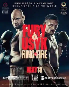 Tyson Fury vs. Oleksandr Usyk, billed as Ring of Fire, was a professional boxing match contested on 18 May 2024, for the WBA (Super), WBC, IBF, WBO, IBO and The Ring undisputed heavyweight championship.