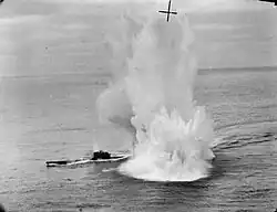 The U-boat, now under the command of Oberleutnant zur See Siegfried Straub, left Brest on 29 February 1944 on her tenth and final patrol.[17] On 10 March, west of Ireland, in position 52°35′N 20°19′W / 52.583°N 20.317°W, she was sunk by depth charges from a Canadian Sunderland patrol bomber EK591 "2U" from No. 422 Squadron RCAF. All 53 hands were lost.[1] "The crew of the Canadian amphibious plane, the Sunderland, reported that it had sunk a German U-boat off the west coast of Ireland and that the crew were swimming around in the water. Pictures of the attack & sinking of U-625, and of some of the crew that escaped in liferafts (not all), were taken by the cameras aboard the Sunderland. The plane circled a few times and headed back to its home base. None of the submarine crew survived; before having a chance to be rescued, they were lost in high seas. Those pictures hung in the office of Sir Winston Churchill for a period during the war; it was the only confirmed proof of a U-boat "kill" by a Canadian coastal squadron during World War II. U-625 was one of 543 German ships that went lost together with its entire crew" (Neitzel & Welzer 2012:261, with two photos on p. 262 of U-625 being attacked and about half of the crew clustered together in the water in one-man rafts.)