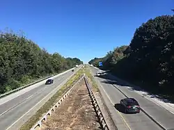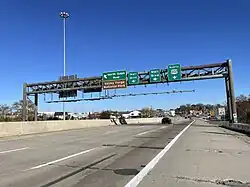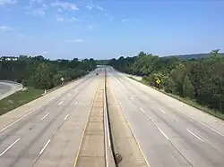 In 1964, a four-lane freeway was proposed that would run parallel to the US 202 corridor in Pennsylvania. The "Piedmont Expressway" was to be 59 miles (95 km) long, and would cost approximately $146 million. Based on the location of the proposed expressway, it would also serve as an outer beltway around the Philadelphia area, similar to the Capital Beltway that encircles Washington, D.C. The Pennsylvania Department of Transportation (PennDOT) divided the proposed US 202 freeway into the following eight sections: Section 100: Concord Township, Delaware County, to West Goshen Township, Chester County (approximately eight miles) Section 200: West Goshen Township, Chester County, to West Whiteland Township, Chester County (approximately six miles) Section 300: East Whiteland Township, Chester County, to Tredyffrin Township, Chester County (approximately seven miles) Section 400: Tredyffrin Township, Chester County, to Upper Merion Township, Montgomery County (approximately five miles) Section 500: Upper Merion Township, Montgomery County, to Norristown, Montgomery County (approximately five miles) Section 600: East Norriton Township, Montgomery County, to Montgomery Township, Montgomery County (approximately nine miles) Section 700: Montgomery Township, Montgomery County, to Doylestown Township, Bucks County (approximately nine miles) Section 800: Doylestown Township, Bucks County, to New Hope, Bucks County (approximately ten miles)[12] Construction on the first portion of the proposed US 202 expressway from West Chester to King of Prussia began in 1965. At the time, US 202 ran on local roads from the West Chester borough to Paoli, then forming a brief concurrency with US 30 before turning north onto present-day PA 252 to King of Prussia. The new freeway alignment was known as the "Paoli Bypass" at the time of its construction, as it begins at the West Chester Bypass (US 322), bypasses Paoli to the north, and ends at the I-76 interchange in King of Prussia. The freeway opened in sections, with the portion between PA 252 and I-76 opening in 1967, the portions from US 322 to PA 100 and US 30 to PA 252 opening in 1970, and the final portion from PA 100 to US 30 opening in 1971. The new freeway, which was connected with the existing West Chester Bypass, completed a continuous, limited-access highway from just south of West Chester to King of Prussia. As a result, the US 202 designation was moved off of local roads in the area and onto the new continuous expressway.[12] Construction on the second portion of the expressway began in 1971 near Doylestown. The new route, completed in 1976, begins at an interchange with PA 611, bypasses Doylestown to the south and west, then terminates just before the intersection with PA 313. Both ends of the expressway were constructed with plans to continue the expressway further in both directions as part of the larger US 202 expressway plan. However, environmental concerns, local opposition, and continued development along the US 202 corridor in Bucks and Montgomery counties prevented further construction of the expressway. As of 2024, the segments of US 202 from West Chester to King of Prussia and south of Doylestown remain the only expressway sections of US 202 in Pennsylvania.[13]