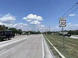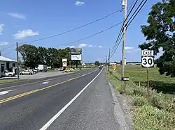 US 30 runs along the southern border of Adamsburg and becomes a divided highway as it reaches an interchange with Edna Road serving Adamsburg. The road becomes five lanes with a center left-turn lane and passes through Lincoln Heights and running along the southern border of Jeannette.[2][3]