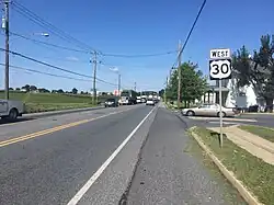 Past the interchange with the eastern terminus of PA 462, US 30 heads east-southeast along Lincoln Highway, a five-lane road with a center left-turn lane, passing through Greenland.[2][3] The route heads into the Pennsylvania Dutch Country of eastern Lancaster County and is lined with many Amish tourist attractions.[4][5] The road crosses Mill Creek and heads north of the Tanger Outlets Lancaster outlet mall and south of the Dutch Wonderland amusement park. US 30 passes south of the Willow Hill Covered Bridge and American Music Theatre and runs between two shopping centers before it reaches an intersection with PA 896. Past this intersection, the route narrows to a three-lane road with a center left-turn lane and heads through agricultural areas with some development, passing through Soudersburg. US 30 crosses the Pequea Creek and runs through Paradise before it comes to a bridge over Amtrak's Keystone Corridor railroad line. From here, the route continues east-southeast a short distance to the north of the Amtrak line. The road closely parallels the railroad tracks as it heads through Kinzers. The Amtrak line diverges to the south east of here. The route splits into a one-way pair, with two lanes in each direction, as it reaches Gap and comes to an intersection with the eastern terminus of PA 772. US 30 continues along the one-way pair, with both directions rejoining at a junction with the northern terminus of PA 41. Past the PA 41 junction, the route is a four-lane divided highway that soon turns into a three-lane road with a center left-turn lane, intersecting the southern terminus of PA 897. The road leaves Gap and turns into a three-lane road two eastbound lanes and one westbound lane as it ascends a hill. Farther east, the route becomes three lanes with a center left-turn lane.[2][3]