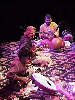 He was the first musician to use the electric mandolin in Carnatic music: he modified the electric western instrument, using five single strings instead of the traditional four doubled strings to suit the Carnatic pitch, raga system, and especially gamakas, or nuanced oscillations.[14] Starting in 1982, he performed regularly during the December season of the prestigious Madras Music Academy, performing there every year except in 2002 - December 23 of each year was a reserved slot for U. Srinivas - the highest accolade.[8][15][16] Srinivas performed at age thirteen at the Berlin Jazz Festival. Initially booked to play a half-hour concert after Miles Davis, Srinivas won a standing ovation, and had to play for another hour.[17] "He's got it in him. He's fantastic,"[18] said the legendary Don Cherry at the time. Guitarist John McLaughlin first heard a tape of this concert by the thirteen-year-old prodigy, and was left very impressed.[19] He played at the Olympic Arts Festival, Barcelona in 1992[15] and in 1995 recorded a successful fusion album with Michael Brook.[20] When John McLaughlin revived his group Shakti, and renamed it Remember Shakti, in 1997, he asked Srinivas to join the group and tour the world with it, along with other Indian musicians Zakir Hussain, Shankar Mahadevan, and V. Selvaganesh. Srinivas was a leading player of the group.[21][22][15] Srinivas toured extensively across the world, in his own right - he played in Australia, Southeast Asia, Southwest Asia, and extensively and frequently across the United States and Canada.[1]