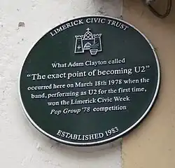 In April 1977, Feedback played their first gig for a paying audience at St. Fintan's High School. Shortly thereafter, the band changed their name to "The Hype".[11] Dik Evans, who was older and by that time attending college, was becoming the odd man out of the group. The other members were leaning towards the idea of a four-piece ensemble.[10] In March 1978, the group changed their name to "U2",[12] selecting it from a list of six options suggested by Steve Averill, a punk rock musician with the Radiators from Space and a family friend of Clayton. The band chose U2 for its open-ended interpretations, visual strength on posters, and because it was the name that they disliked the least.[13] Dik Evans officially left the band with a farewell concert at the Presbyterian Hall in Sutton on 4 March. During the show, which featured the group playing cover songs as the Hype, Dik ceremonially walked offstage. The remaining four members returned later in the concert to play original material as U2.[10][14] Dik joined the Virgin Prunes, a band made up of mutual friends of U2; early on, the Prunes served as U2's default opening act, and the two groups often shared members for live performances to fill in for occasional absences.[15] On 18 March, the four-piece U2 won the "Pop Group '78" talent contest sponsored by the Evening Press and Guinness's Harp Lager as part of Limerick Civic Week.[16] The win was an important milestone and affirmation for the fledgling act.[10] The contest prize consisted of £500 (equivalent to £3,623 in 2023) and a recording session for a demo that would be heard by the record label CBS Ireland.[17] U2's demo tape was recorded at Keystone Studios in Dublin in April 1978,[17] but the results were largely unsuccessful due to their inexperience.[18]