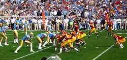 Starting in 2006, the coaches at the time, USC coach Pete Carroll and UCLA coach Karl Dorrell, expressed an interest in restarting the tradition of both teams wearing primary colored home jerseys. At the time, the NCAA football rules Article 3. a. stated, "Players of opposing teams shall wear jerseys of contrasting colors, and the visiting team shall wear white jerseys."[42] USC coach Pete Carroll said he would be willing to lose two timeouts during the game so that the USC team could wear their cardinal jerseys for the UCLA–USC football game on December 6, 2008.[43] It was determined before the 2008 game that the visiting school would only lose one timeout for incorrect equipment. Carroll agreed to forfeit a timeout to satisfy the ruling and Coach Rick Neuheisel agreed to forfeit one, in return (even though, as the coach of the home team, he was not required to do so by the ruling) to get back this tradition, and it was renewed in the 2008 game.[44] In the wake of the coaches' decisions, the NCAA decided to amend their rules regarding away teams' uniforms (which were originally put into place to provide more contrast for black-and-white photography and television broadcasts), changing the rule to state that the teams must agree on the decision for both teams to wear their colored jerseys before the game and that the uniforms must be of easily contrasted colors.[45][41] Since the home team is already required to wear its colored home jerseys and would not be in violation of any equipment rules, this essentially leaves the decision up to them as to whether or not to allow the visiting team is to wear their home uniforms.