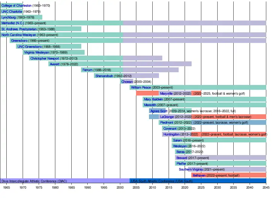 - 1963 - The USA South was founded as the Dixie Intercollegiate Athletic Conference. It was a member of the National Association of Intercollegiate Athletics (NAIA). Charter members included Charlotte College (now the University of North Carolina at Charlotte), the College of Charleston, Lynchburg College (now the University of Lynchburg), Methodist College (now Methodist University), North Carolina Wesleyan College (now North Carolina Wesleyan University), and St. Andrews Presbyterian College (now St. Andrews University), effective beginning the 1963-64 academic year.