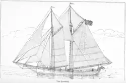 In addition to meeting the Fish Commission's research and fish culture requirements, Grampus's design also reflected ideas for improvement in the design of the then-conventional New England commercial fishing schooners so as to improve both speed and safety.[4] In the mid-1880s, these schooners tended to be wide, shallow, and sharp so as to allow the greatest possible speed by reducing drag through the water and allowing the ship to carry a considerable amount of sail. In order to keep the hulls shallow, the schooners were "very wide aft, with a heavy, clumsy stern and fat counters, the run being hollowed out excessively so as to produce in the after section a series of very abrupt horizontal curves."[4] The two masts came to nearly the same height above the waterline, and the schooners carried a large jib extending from the bowsprit end to the foremast.[4]