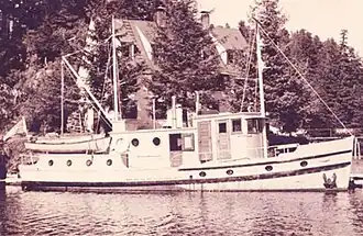In addition to performing their primary duty of fishery patrols in the waters of Southeast Alaska, Auklet and Murre often engaged in other activities.[2] They assisted the United States Department of War in inspecting active and abandoned fish traps as possible navigational obstructions,[2] and took part in routine stream improvements, which involved the removal of impediments to salmon – such as log jams and beaver dams – as they ascended to their spawning grounds.[2] Auklet also provided transportation to BOF personnel and hauled supplies to settlements and BOF stations in Southeast Alaska,[2] and during a steamship strike in 1920 she transported foodstuffs from Prince Rupert, British Columbia, Canada, to merchants in Wrangell and Ketchikan, Alaska.[2] After Murre struck a rock in Alaska's Keku Strait on 1 April 1920 and was beached to prevent her from sinking, Auklet arrived on the scene and towed Murre to Wrangell for repairs.[2]