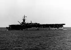 The ship remained laid up until 5 September 1953, when she was transferred to the French Navy as aid according to the Mutual Defense Assistance Act. During this period, she was renamed Bois Belleau.[4] The French, then at the height of the First Indochina War, was in need of additional aircraft carriers to support the two light carriers—La Fayette (formerly USS Langley), and Arromanches (formerly HMS Colossus)—then operating off French Indochina. The loan of Belleau Wood was ordered by President Dwight D. Eisenhower. The French Navy initially had trouble putting together a crew to man the ship, which delayed her delivery to France until December. In addition, her boilers were found to be in poor condition upon her reactivation, which required repairs once she arrived in France.[6]