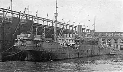 Rhaetia was subsequently interned at Philadelphia, guarded by a round-the-clock police watch.[27] In late August, negotiations between the U.S. government and the German consulate raised the possibility of the sale or transfer to U.S. registry of the ship,[28] but neither eventuated. In March 1915, W. R. Grace & Co. made an offer of $2,000,000 for the purchase of both Rhaetia and her stablemate Prinz Oskar, also in internment at Philadelphia,[29] but this proposal too was unsuccessful and the two ships were to remain in internment until America's entry into the war in April 1917. During the internment period, many members of the two ships' crews applied for United States citizenship, with about 60 having their applications accepted.[30]