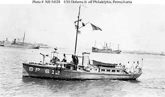 ![]() USS Dohema Jr. (SP-612) off Philadelphia, Pennsylvania, during World War I. In the right background is the Swedish commercial cargo ship Hermes with World War I neutrality markings painted on her side.