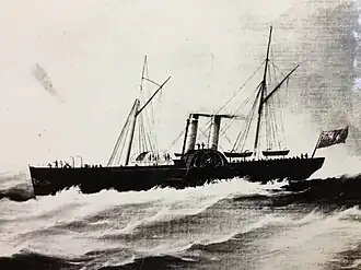 Under the command of Captain Quayle, Douglas made her inaugural crossing from Douglas to Liverpool on Tuesday, 6 July 1858.[3] She achieved over 17 knots (31 km/h; 20 mph) on the trip and immediately broke the record for the crossing time between Douglas and Liverpool, achieving a time of 4 hours 20 minutes.This broke the previous record of 4 hours 50 minutes set in September 1856 by SS Mona's Queen .[5] On her return run to the Isle of Man, Douglas would routinely record a passage time of 4 hours 40 minutes. Ancillary work consisted of charter sailings and day excursions, one of which was on 14 October 1859, when Douglas made an excursion to Holyhead, Wales, to see the ocean liner SS Great Eastern.[6] On another occasion, she was chartered to Henderson's of Belfast, Ireland, for three weeks for the then-notable fee of £200 per week.