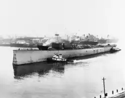 Kentucky's construction was plagued by suspensions. Her keel was laid down at the Norfolk Navy Yard, Portsmouth, Virginia, on 7 March 1942.[5] However, work on the ship was suspended in June that year, and Kentucky's bottom structure was launched to make room for LST construction on 10 June.[5][17][18] Work on the ship resumed on 6 December 1944, when the keel structure was moved to Dry Dock 8. Work on the battleship proceeded at a slow pace, and her completion was projected for the third quarter of 1946. In December 1945 it was recommended that Kentucky be completed as an anti-aircraft battleship, and work on the ship was suspended in August 1946 while this was considered. Construction resumed again on 17 August 1948 without any decision having been made on her final design.[5] Work on Kentucky continued until 20 January 1950, when it was decided to halt work on the ship.[19] Following this, she was floated out of her drydock to clear a space for repairs to sister ship Missouri, which had run aground en route from Hampton Roads.[20][21]