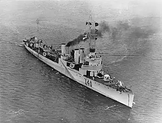 As Georgetown, she participated in operation "Bowery", escorting the aircraft carrier Wasp in May 1942 on her second reinforcement of the Supermarine Spitfire strength on the island of Malta. In September 1942, she transferred to the Royal Canadian Navy for convoy escort duties in the western Atlantic, captained by Lt. Cdr. Peter Graeme MacIver.[1] Georgetown was modified for trade convoy escort service by removal of three of the original 4"/50 caliber guns and one of the triple torpedo tube mounts to reduce topside weight for additional depth charge stowage and installation of Hedgehog anti-submarine launcher.[2] Returned to the United Kingdom in December 1943, she joined the Reserve Fleet.