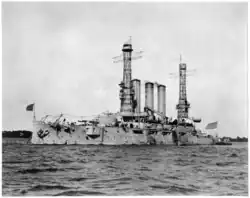 Maine's next significant action was the cruise of the Great White Fleet around the world, which started with a naval review for President Theodore Roosevelt in Hampton Roads.[3] The cruise of the Great White Fleet was conceived as a way to demonstrate American military power, particularly to Japan. Tensions had begun to rise between the United States and Japan after the latter's victory in the Russo-Japanese War in 1905, particularly over racist opposition to Japanese immigration to the United States. The press in both countries began to call for war, and Roosevelt hoped to use the demonstration of naval might to deter Japanese aggression.[5] On 17 December, the fleet steamed out of Hampton Roads and cruised south to the Caribbean and then to South America, making stops in Port of Spain, Rio de Janeiro, Punta Arenas, and Valparaíso, among other cities. After arriving in Mexico in March 1908, the fleet spent three weeks conducting gunnery practice.[6] The fleet then resumed its voyage up the Pacific coast of the Americas, stopping in San Francisco, where Maine was detached from the rest of the fleet. The ship's boilers had proved to be badly inefficient, requiring excessive amounts of coal to keep up with the fleet. The battleship Alabama also left the fleet, owing to a cracked cylinder head.[7]