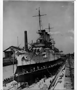 USS Maine (BB-10), the lead ship of her class of pre-dreadnought battleships, was the second ship of the United States Navy to be named in honor of the 23rd state. Maine was laid down in February 1899 at the William Cramp & Sons shipyard in Philadelphia. She was launched in July 1901 and commissioned into the fleet in December 1902. She was armed with a main battery of four 12-inch (305 mm) guns and could steam at a top speed of 18 knots (33 km/h; 21 mph).