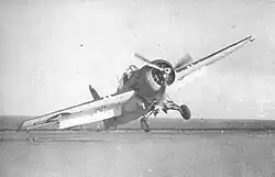 One 5 in (127 mm)/38 caliber dual-purpose gun was mounted on the stern. Anti-aircraft defense was provided by eight Bofors 40 mm (1.6 in) anti-aircraft guns in single mounts, as well as twelve Oerlikon 20 mm (0.79 in) cannons, which were mounted around the perimeter of the deck.[2] By the end of the war, Casablanca-class carriers had been modified to carry thirty 20 mm (0.79 in) cannons, and the number of Bofors 40 mm (1.6 in) guns had been doubled to sixteen, by putting them into twin mounts. These modifications were in response to increasing casualties due to kamikaze attacks. Although Casablanca-class escort carriers were designed to function with a crew of 860 and an embarked squadron of 50 to 56, the exigencies of wartime often necessitated the inflation of the crew count. Casablanca-class escort carriers were designed to carry 27 aircraft, but the hangar deck could accommodate more. During the Mariana and Palau Islands campaign, Marcus Island carried 16 FM-2 Wildcat fighters and 12 TBM-1C Avenger torpedo bombers for a total of 28 aircraft.[4] At the beginning of the Philippines campaign, she carried 17 FM-2 Wildcats and 12 TBM-1C Avengers for a total of 29 aircraft.[5] During the Battle of Mindoro, she carried 24 FM-2 Wildcats and 9 TBM-1C Avengers for a total of 33 aircraft. This increase in fighter capabilities was due to the threat of kamikaze attacks.[6] During the Invasion of Lingayen Gulf, she carried 26 FM-2 Wildcats and 9 TBM-1C Avengers for a total of 35 aircraft.[7] By the Battle of Okinawa, she carried 20 FM-2 Wildcats, 11 TBM-3 Avengers, and a TBM-3P photo-reconnaissance plane for a total of 32 aircraft.[2][8]