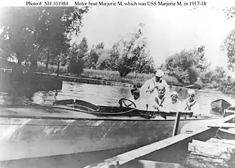 ![]() Marjorie M. as a private motorboat. The United States Navy officer and four enlisted men aboard her indicate that this photograph was taken around the time of her acquisition by the U.S. Navy in August 1917.