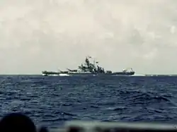 On 23 March, TF 58 steamed southwest to begin preparatory attacks on Okinawa in advance of the landing on the island. The next day, the carriers of TG 58.1 destroyed a convoy of eight transports off Kyushu and Massachusetts was detached in company with the battleships Indiana, New Jersey, and Wisconsin as TF 59 to shell Okinawa, thereafter returning to their carrier groups.[33] The ship spent much of April operating off the island, helping to fend off heavy Japanese air attacks. Throughout this period, the carrier task groups rotated through the station, with two groups in action at any given time. Heavy and repeated kamikaze attacks hit numerous vessels over the course of the campaign, but Massachusetts was not targeted by the suicide craft. In late May, Third Fleet resumed command of the task force, and Massachusetts' unit was accordingly re-numbered TG 38.1. On 5 June, the ship passed through another typhoon that did not inflict serious damage to Massachusetts. Five days later, Massachusetts steamed to shell Japanese facilities on the island of Minami Daito Jima in the Ryukyus. Following this bombardment, TF 38 withdrew to Leyte Gulf after three months of continuous operations.[6][34]