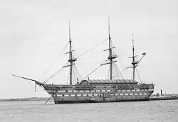 New Hampshire sailed from Portsmouth, New Hampshire, on 15 June and relieved sister ship Vermont on 29 July 1864 as store and depot ship at Port Royal, South Carolina,[5] and served there through the end of the Civil War. She returned to Norfolk, Virginia, on 8 June 1866, serving as a receiving ship there until 10 May 1876, when she sailed back to Port Royal. She resumed duty at Norfolk in 1881 but soon shifted to Newport, Rhode Island. She became flagship of Commodore Stephen B. Luce's newly formed Apprentice Training Squadron, marking the commencement of an effective apprentice training program for the Navy. Four of New Hampshire's crewmen earned the Medal of Honor for jumping overboard to rescue fellow sailors from drowning in two separate 1882 incidents: Quartermaster Henry J. Manning and Ship's Printer John McCarton on 4 January 1882, and Boatswain's Mate James F. Sullivan and Chief Boatswain's Mate Jeremiah Troy on 21 April 1882.[6]