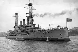 New Hampshire was laid down on 1 May 1905 at the New York Shipbuilding Corporation in Camden, New Jersey. She was launched on 30 June 1906. The ship was commissioned into the US Navy on 19 March 1908; her first commander was Captain Cameron Winslow. After completing final fitting-out work, New Hampshire transported a Marine Expeditionary Regiment to Colón, Panama on 20 June, arriving six days later. She then made a series of visits to ports on the eastern coast of North America, including Portsmouth, New York, and Bridgeport, along with a stop in the Canadian province of Quebec. The ship was then overhauled in New York, followed by training exercises in the Caribbean Sea. On 22 February 1909, she participated in a Naval Review for President Theodore Roosevelt to greet the return of the Great White Fleet in Hampton Roads, Virginia.[3] During this period, Ernest King, later the Chief of Naval Operations during World War II, served aboard the ship in the engine room.[4]
