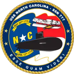 USS North Carolina (SSN-777), a Virginia-class attack submarine, is the fourth vessel of the United States Navy named for U.S. state of North Carolina. The contract to build her was awarded to Northrop Grumman Newport News on 30 September 1998 and her keel was laid down on 24 May 2004. She was launched on 5 May 2007. North Carolina was commissioned on 3 May 2008 in Wilmington, North Carolina.