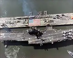 Oriskany's post-service history also differs considerably from that of her sister ships. Decommissioned in 1976, she was sold for scrap in 1995, but was repossessed in 1997 because nothing was being done. In 2004, the Navy decided to sink her to create an artificial reef off the coast of Florida in the Gulf of Mexico. After much environmental review and remediation to remove toxic substances, the ship was carefully sunk in May 2006. She settled in an upright position at a depth accessible to recreational divers. As of August 2025, Oriskany is the largest vessel ever sunk as an artificial reef, a record that is set to be broken by the ocean liner SS United States.[1][2]