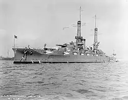 USS Pennsylvania (BB-38) was the lead ship of the Pennsylvania class of super-dreadnought battleships built for the United States Navy in the 1910s. The Pennsylvanias were part of the standard-type battleship series, and marked an incremental improvement over the preceding Nevada class, carrying an extra pair of 14-inch (356 mm) guns for a total of twelve guns. Named for the Commonwealth of Pennsylvania, she was laid down at the Newport News Shipbuilding and Drydock Company in October 1913, was launched in March 1915, and was commissioned in June 1916. Equipped with an oil-burning propulsion system, Pennsylvania was not sent to European waters during World War I, since the necessary fuel oil was not as readily available as coal. Instead, she remained in American waters and took part in training exercises; in 1918, she escorted President Woodrow Wilson to France to take part in peace negotiations.