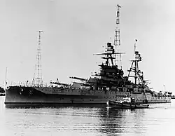 The ship left San Francisco on 20 February and began gunnery training before returning to San Francisco the next day. Further training followed in March, and from 14 April to 1 August, she took part in extensive maneuvers off the coast of California;[11] during this period, she underwent an overhaul at the Mare Island Naval Shipyard in San Francisco. The work involved considerably strengthening the ship's anti-aircraft capabilities, with ten Bofors 40 mm quad mounts and fifty-one Oerlikon 20 mm single mounts. The tripod mainmast was removed, with the stump replaced by a deckhouse above which the aft main battery director cupola was housed. One of the new CXAM-1 radars was installed above the cupola. The older 5-inch /51 cal anti-ship guns in casemates and 5-inch /25 cal anti-aircraft guns were replaced with rapid fire 5-inch /38 cal guns in eight twin turret mounts. The new 5"/38 cal dual purpose guns could elevate to 85 degrees and fire at a rate of one round every four seconds.[3] The ship briefly went to sea during the Battle of Midway as part of Task Force 1, commanded by Vice Admiral William S. Pye, but the ships did not see action during the operation.[11]