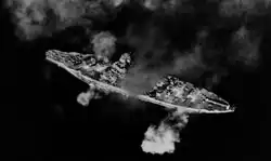 In the early hours of 25 October, the Southern Force came into contact with Oldendorf's battleships, which had positioned themselves to cross Nishimura's T. At 03:53, West Virginia opened fire, followed by some of the other battleships,[11] though Pennsylvania had trouble locating a target in the darkness with her search radar. Her older Mark 3 radar was not as effective as the more modern sets on West Virginia and some of the other battleships.[15] Task Group 77.2's battleships effectively annihilated Battleship Division 2; Shima's Second Striking Force had fallen behind and had not yet entered the fray. Yamashiro was set on fire and then exploded; she turned to flee, covered by a salvo of torpedoes from the burning Mogami, but the American battleships were able to evade them without damage. Despite having disengaged from Oldendorf's battleships, Yamashiro was hit by more torpedoes and capsized and sank around 04:20.[16] Shima's ships passed the still-floating Fusō and realized that Nishimura had entered a trap, so he reversed course to flee; in the confusion, his flagship Nachi collided with Mogami, damaging her and slowing her to be attacked by American light forces. She was later sunk, as were three of the four destroyers. Later on 25 October, Pennsylvania's anti-aircraft gunners helped to shoot down four aircraft that attacked a nearby destroyer.[11][17]