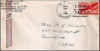 With the war over, Tennessee was tasked with covering the landing of occupation troops at Wakayama, Japan, arriving there on 23 September. She then steamed to Yokosuka, where her crew inspected one of the Japanese fleet's main naval bases. On 16 October, she departed for Singapore, where Oldendorf transferred to the cruiser USS Springfield; from there, Tennessee crossed the Indian Ocean, rounded the Cape of Good Hope, and steamed up the Atlantic to the Philadelphia Navy Yard, which she reached on 7 December. This route had been dictated by her 1943 rebuild, as the large anti-torpedo blisters had increased her beam too greatly to allow her to pass through the Panama Canal. In the course of the war, Tennessee had fired a total of 9,347 shells from her main battery, 46,341 shells from her 5-inch guns and more than 100,000 rounds from her antiaircraft battery. She received 10 battle stars for her service in the war.[5]