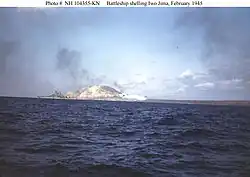 Tennessee kept up the bombardment through 18 February; over the two days of shelling, she destroyed numerous pillboxes and an ammunition dump and set several fires around the island. The next morning, the troop transports arrived off the island and began preparations to send marines ashore. Tennessee and the rest of the bombardment group, reinforced by the fast battleships North Carolina and Washington and three cruisers, opened up with slow and deliberate fire on the landing beaches. The shooting was interrupted by a carrier strike, after which the ships took up a heavier pace of fire. Just as the marines were about to hit the beach at 09:00, the ships' main batteries ceased firing and their secondaries employed a rolling barrage to clear a path for the marines. As they probed the Japanese defenses and encountered strongpoints, the marines called on Tennessee and other ships to knock them out by way of shore fire control parties that were tied to individual ships.[5]