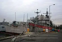 On 4 May 2004, she completed transit of the Panama Canal and then moved to cross the equator. Her ship crew engaged in the rites and rituals of the crossing, inducting the captain of the ship and many of the crew in to "Shell-Backs". She completed her final deployment on 3 August 2004. Ticonderoga then made liberty port visits to Cozumel, Mexico (15-17 March); Colon (27-28 March); Mayport (1-9 April); Guantánamo Bay (12-13 April); Cartagena, Colombia (27-29 May); Vasco Núñez de Balboa, Panama (6-7 May); and Puerto Quetzal, Guatemala (17-19 May). She conducted counter-narcotics operations in conjunction with Colombian military authorities from April–June. Ticonderoga successfully intercepted five cigarette-shaped "go-fast" smuggling boats, and one fishing vessel, netting over 14,000 pounds of cocaine, and detaining 25 suspects in the process. She was decommissioned on 30 September of that year. After her decommissioning, she was towed to the Naval Inactive Ship Maintenance Facility in Philadelphia. In 2010, she was offered for museum donation by the Navy. An effort was made to bring Ticonderoga to Pascagoula, Mississippi, where she was built, to serve as a museum ship.[8] In May 2013, the vessel was formally stricken from the Naval Vessel Register, for disposal.[9] In October of the same year, The Ticonderoga Historical Society reported that the US Navy was going to scrap the ship after a number of potential museum sites were unable to add her to their collections.[10] In June 2014, NAVSEA released a disposal reporting letter declaring the ex-Ticonderoga to be available for inspection by bidders and ready for disposal by scrapping or sinking.[11] In September 2020, she arrived at Brownsville, Texas, for scrapping.[1]