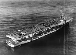 Windham Bay was a Casablanca-class escort carrier, the most numerous type of aircraft carriers ever built,[2] and designed specifically to be mass-produced using prefabricated sections, in order to replace heavy early war losses. Standardized with her sister ships, she was 512 ft 3 in (156.13 m) long overall; at the waterline, she was 490 ft (150 m) long. She had a beam of 65 ft 2 in (19.86 m), at her widest point, this was 108 ft (33 m). She also had a draft of 20 ft 9 in (6.32 m). She displaced 8,188 long tons (8,319 t) standard, 10,902 long tons (11,077 t) with a full load. She had a 257 ft (78 m) long hangar deck and a 477 ft (145 m) long flight deck. She was powered with two Skinner Unaflow reciprocating steam engines, which drove two shafts, providing 9,000 shaft horsepower (6,700 kW), thus enabling her to make 19 knots (35 km/h; 22 mph). The ship had a cruising range of 10,240 nautical miles (18,960 km; 11,780 mi) at a speed of 15 knots (28 km/h; 17 mph). Power was provided by four Babcock & Wilcox water-tube boilers. Her compact size necessitated the installation of an aircraft catapult at her bow, and there were two aircraft elevators to facilitate movement of aircraft between the flight and hangar deck: one each fore and aft.[2][3][4]