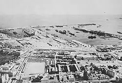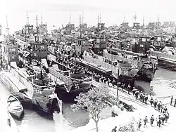 Amphibious Training Bases at and around Oran started in May 1943 under the reverse Lend-Lease with Free France. At the same time, an Amphibious Training Base opened at Ténès and Béni Saf Algeria. After the Tunisian campaign, Oran supported the operation of the Amphibious Training Bases at Bizerte, Tunis, and Ferryville in Tunisia. The towns of Cherchel, Bone, and Mostaganem east of Oran, and Nemours west of Oran became troop staging for upcoming Allied invasions, became the scene of practice invasions. Detachments from the 54th, 70th, and 120th Construction Battalions were responsible for whatever naval establishments were required, but these towns required little in the way of installations.[19][20] A ship's salvage unit, a naval radio station, and a fuel depot were established in Algiers, which was also the site of the headquarters of Vice Admiral H.K. Hewitt, USN, Commander Naval Forces in Northwest African Waters. The two most common amphibious ships used at the base were Landing Ship, Tank (LST), Landing Craft Infantry (LCI), LCP boats, Landing craft tank and Landing Craft Mechanized boats.[1][21][22][23] The lessons of North Africa helped in improving the future landing and battles of World War II.[24]