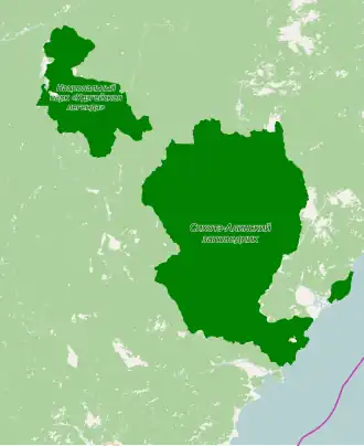 Udegeyskaya Legenda National Park (Russian: Удэгейская легенда, which translates as Udege Legend) covers the richest coniferous-deciduous forest on the western slope of the Central Sikhote-Alin mountains of the Russian Far East.[1] The Sikhote-Alin is a range that runs north-south through Primorsky Krai (in English, "Maritime Region"). The park is designed to protect west-slope river valley habitat, and to support the remnant of the indigenous Udege people. The area is known for abundant fishing and boating on the streams and rivers. It is also a refuge for the endangered Amur tiger. The park is roughly midway between the city of Vladivostok (520 km to the southwest), and Khabarovsk (440 km to the northwest). The relatively warm waters of the Sea of Japan are to the east, the Korean peninsula to the south, and China to the West.[2]