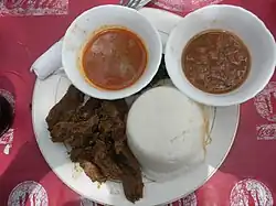 Ugali, also known as posho, nsima, papa, pap, mogobe, sadza, isitshwala, akume, amawe, ewokple, akple, and other names, is a type of corn meal made from maize or corn or mahindi flour in several African countries: Kenya, Uganda, Tanzania, Zimbabwe, Zambia, Lesotho, Eswatini, Angola, Mozambique, Namibia, Democratic Republic of the Congo, Malawi, Botswana and South Africa, and in West Africa by the Ewes of Togo, Ghana, Benin, Nigeria and Côte d'Ivoire.[1] It is cooked in boiling water or milk until it reaches a stiff or firm dough-like consistency.[2] In 2017, the dish was added to the UNESCO Representative List of the Intangible Cultural Heritage of Humanity, one of a few foods on the list.[3]
