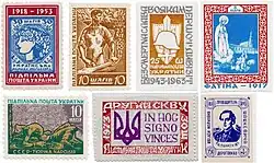 The Ukrainian Underground Post (Ukrainian: Підпільна пошта України, converted in Ukrainian Latin alphabet to Pidpilna Poshta Ukrainy (abbeviation: PPU)),[9][8] also known as the Underground Post of Ukraine, was founded by Ukrainian exiles from West Germany in 1949 under a branch of the Organisation of Ukrainian Nationalists.[10] According to PPU stamp cataloguer and philatelist Stefan Golash, Regensburg resident and former 14th Waffen Grenadier Division of the SS (1st Galician) volunteer Stepan Liubomyr Rychtyckyj (writing under the pseudonym Stefan Liubomyrsky) first took interest in writing and philately while he and his former division were interred in a prisoner of war camp in the Italian city of Rimini until his release in 1946. In 1949, he met Ukrainian philatelist and fellow Regensburg resident Julian Maksymchuk, who with the latter's influence and guidance established the postal agency, which released its first set of stamps the same year.[10][8] As an internationally unrecognized postal agency, the Underground Post of Ukraine issued non-state postage stamps that were primarily used for propaganda purposes.[7]