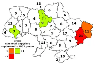 Number of single-mandate constituencies per oblast compared with year 2002.