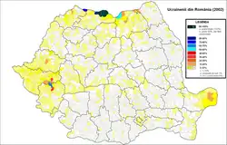 The Ukrainians of Romania (Ukrainian: Українці Румунії, romanized: Ukrayintsi Rumuniyi, Romanian: Ucrainenii din România) are the third-largest ethnic minority in Romania. According to the 2011 Romanian census they number 51,703 people, making up 0.3% of the total population.[2] According to the 2021 Romanian census, there were 45,835 people who identified themselves officially as Ukrainians (0.24%), and 40,861 who declared that their language was Ukrainian.[1] Ukrainians claim that the number is actually 250,000–300,000.[8] Ukrainians mainly live in northern Romania, in areas close to the Ukrainian border. Over 60% of all Romanian Ukrainians live in Maramureș County (31,234), where they make up 6.77% of the population. According to the U.S. Census Bureau, in 2015, there were 345 ethnic Ukrainians born in Romania who lived in the United States of America at that time.[9]
