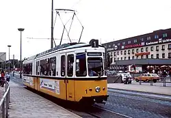 The Ulm tramway opened two lines to the Ulm station forecourt on 15 May 1897. While one tram line linked the stations of Ulm and Neu-Ulm, the other ran on the ring around the city centre. Construction of the Zingler Bridge that crosses the tracks south of the station gave the residents of the suburbs lying to the west of the station a connection to the Ulm trams that they had long demanded. The tram crossed the bridge and continued to Söflingen from 18 October 1906. On 14 May 1947, an Ulm trolleybus service was put into operation; its two lines had a stop at Ulm station. It replaced tramline 2 to Neu-Ulm, which had been closed on the 24 December 1944 due to the effects of the war. On 23 October 1963, the trolleybus operation was abandoned and replaced by diesel buses. Starting from 22 May 1967, Ulm tramline 1 used the Ehinger-Tor underpass, completed in 1966, from Donaustadion to Söflingen instead of the Zingler bridge. On 21 March 2009, line 1 was extended from Donauhalle to Böfingen.[47] On 12 September 2018 tramline 2 was opened.[48]