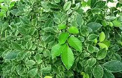 The tree is distinguished by its small leaves, which rarely exceed 18 mm in length and feature at first irregular white-flecked margins, "finally white only on the teeth".[3][4] The foliage emerges creamy-yellow in spring,[5] some leaves remaining pale later into the year.[6] The canopy turns rich yellow in the fall.[7] Descriptions of the cultivar's vigour and ultimate height vary from "a slow-growing shrub attaining no more than 8 ft (2.5 m)",[6] to "growing at a fast rate, to about 20 ft tall at maturity, with a spread of 15 ft".[7]