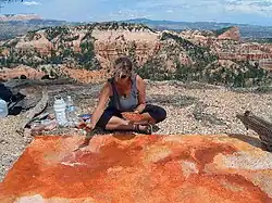 Earth paintings are typical of Arnold's art as she uses a unique material. She paints pictures with sorts of soil, minerals and stones on nettle fabric and on stone. She collects her colours in form of minerals which she then grinds to a paste for painting. The titles of her pictures correspond to the places across the world where she has found her ingredients, like Flagstaff, Arizona or Bryce Canyon in Utah. The structures, forms and colours of those paintings mirror the quality of the landscape where they are created on site. There they are exposed to the natural conditions of the place which even enhance their intensity.