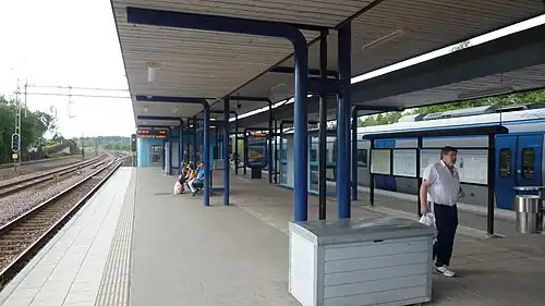 When Stockholm's commuter rail network was launched in 1968, the station remained largely unchanged due to uncertainty about the area's future development. However, after the original station building was damaged in a fire in 1979 and later demolished in the early 1980s, the need for modernization became apparent. In August 1990, a new commuter train station with four tracks and an island platform was opened as part of the expansion of the railway to four tracks.