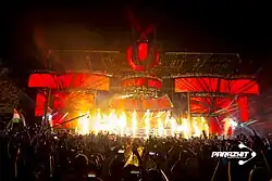 As band member Maxim was unable to attend due to medical issues, The Prodigy cancelled their Saturday night performance. Deadmau5 took their place, alongside his previously scheduled A State of Trance performance on Sunday.[82][84][85] Pendulum formally closed the festival on Sunday night, briefly playing as their offshoot Knife Party, and featuring guest appearances by Tom Morello and Deadmau5 (the latter for "Ghosts 'n' Stuff"—which features Pendulum's Rob Swire).[86] The Resistance stage also returned, which featured Arcadia Spectacular's "Spider".[87][88][89]
