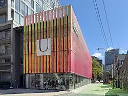 The building was constructed for the Umbra design company in 2007 to a design by Kohn Shnier Architects.[5][6] The building has translucent bright pink vertical bands that wrap a glass structure positioned on the corner of a side street, surrounded by monotone brick construction. In comparison to the surrounding architecture the building is considerably smaller. The building is three stories tall. The overall axis of the structure is predominantly vertical with a centralized plan. The building in plan is a rectangle with a smaller rectangle offset to the middle that is positioned off center towards the main elevation.